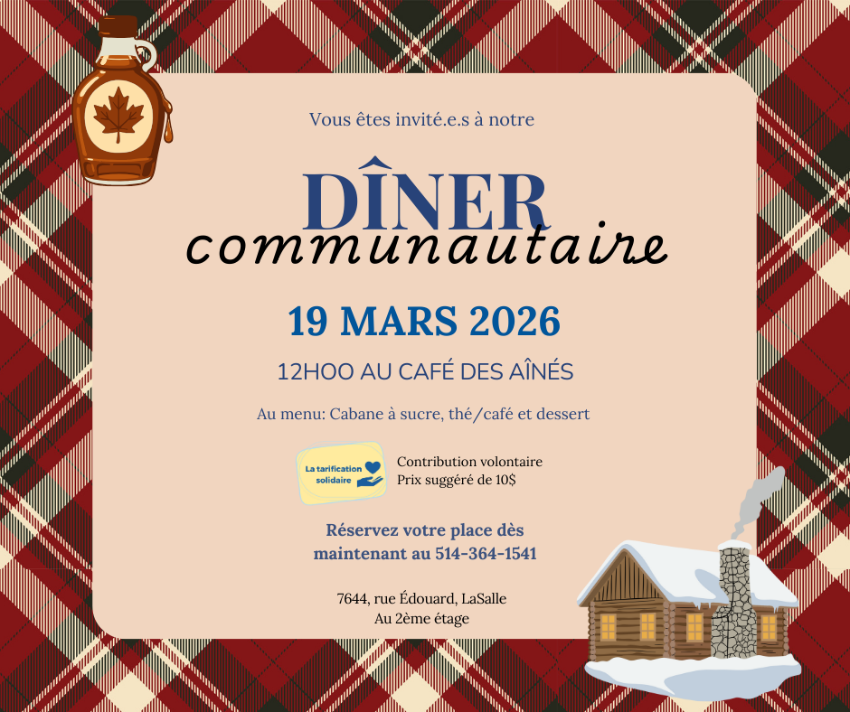 Merci pour le Café des aînés avec ses muffins généreux. Merci pour votre générosité. Merci pour les prix raisonnables. Merci aux bénévoles qui servent les repas. Merci pour l’organisation bien rodée de ce Centre. Merci pour le Moulin Bus qui permet à certaines personnes de se rendre ici et profiter du Café.