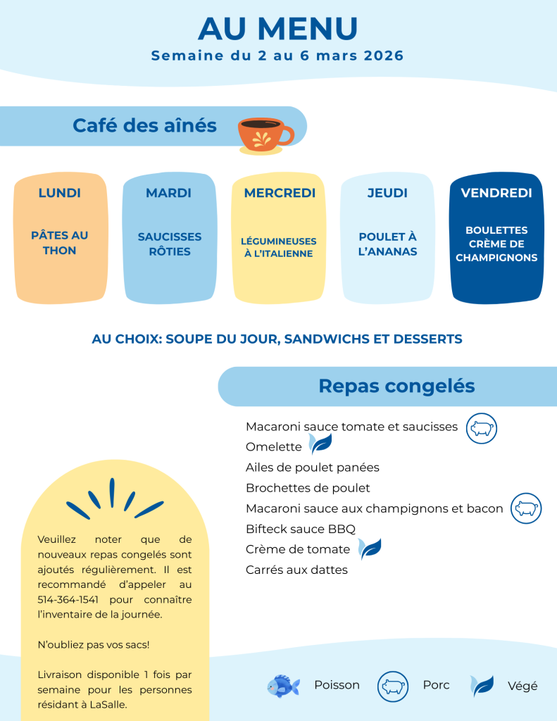Nous vous invitons à apporter vos sacs lors de l’achat des repas congelés pour emporter. Vous aimeriez rapporter les portions restantes après un repas pris au Café des aînés? C’est possible de le faire en apportant vos contenants. Nous vous encourageons à utiliser vos bouteilles d’eau personnelles réutilisables. Tous ces gestes font en sorte de diminuer les déchets et l’utilisation du plastique conformément à notre approche plus éco-responsable.
